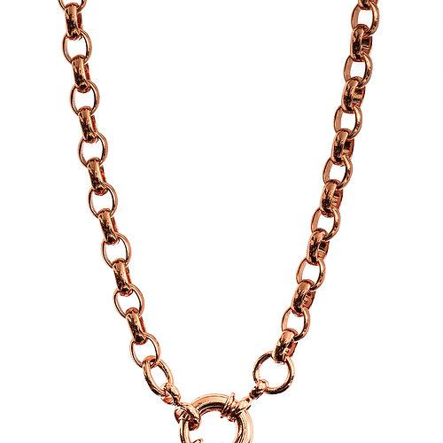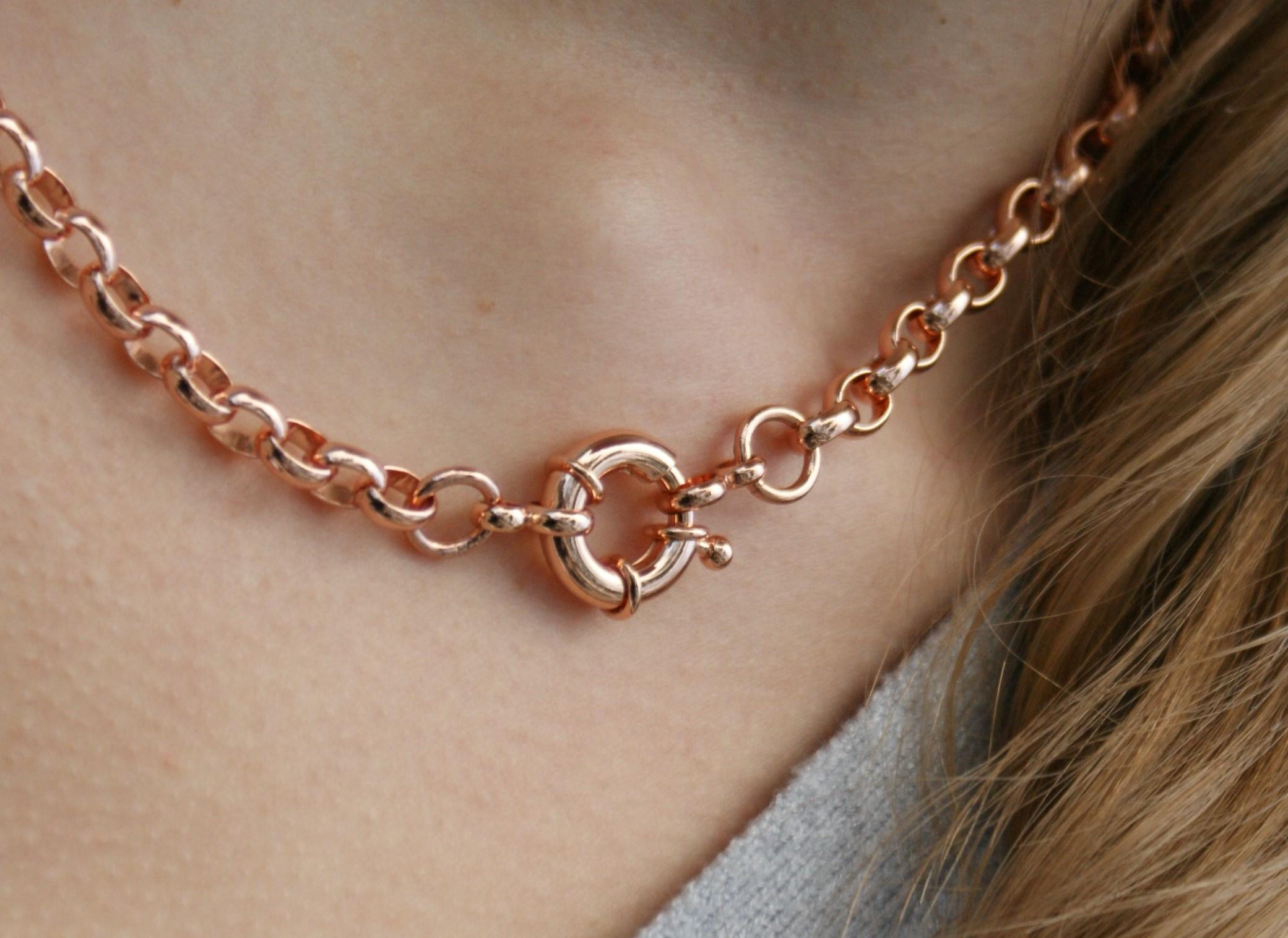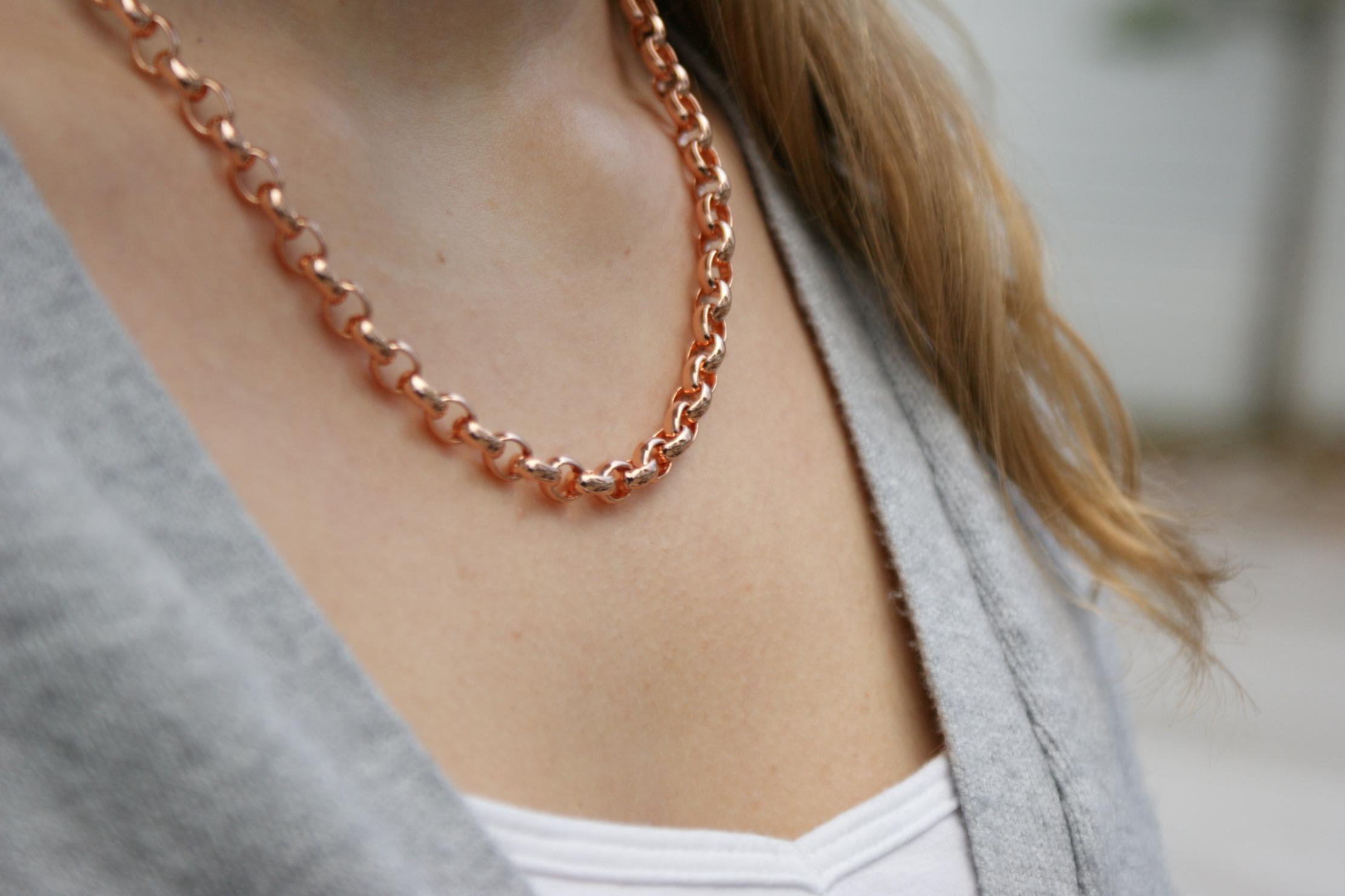 Koruteräksinen kaulakoru. Ruusukullan värinen papuketju, jossa rengaslukko. Pituus 45 cm ja paksuus 5 mm. Ruusukullan väri on saatu korun pintaan ionisoimalla, väri ei kulu. Allergisoimaton, tummumaton materiaali, jolla on ikuinen takuu.