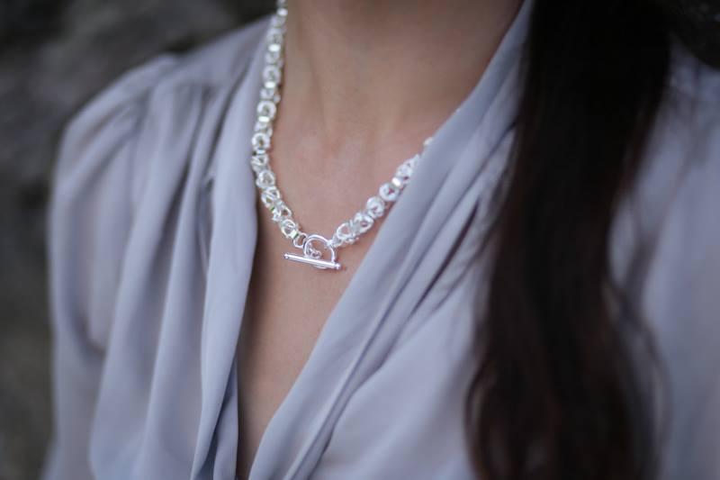 Hopeoitu Toivo-kaulakoru salpalukolla. pituus 44 cm, leveys 7 mm.