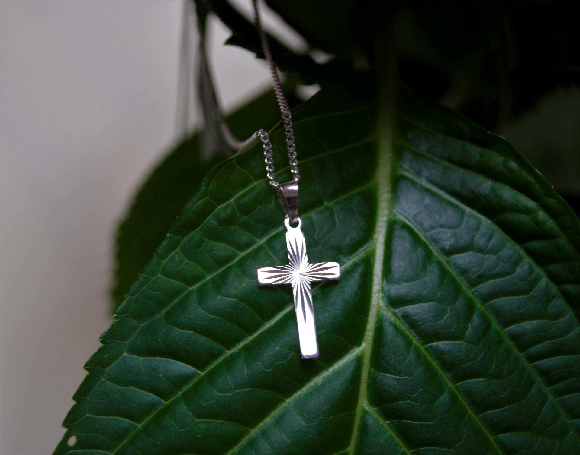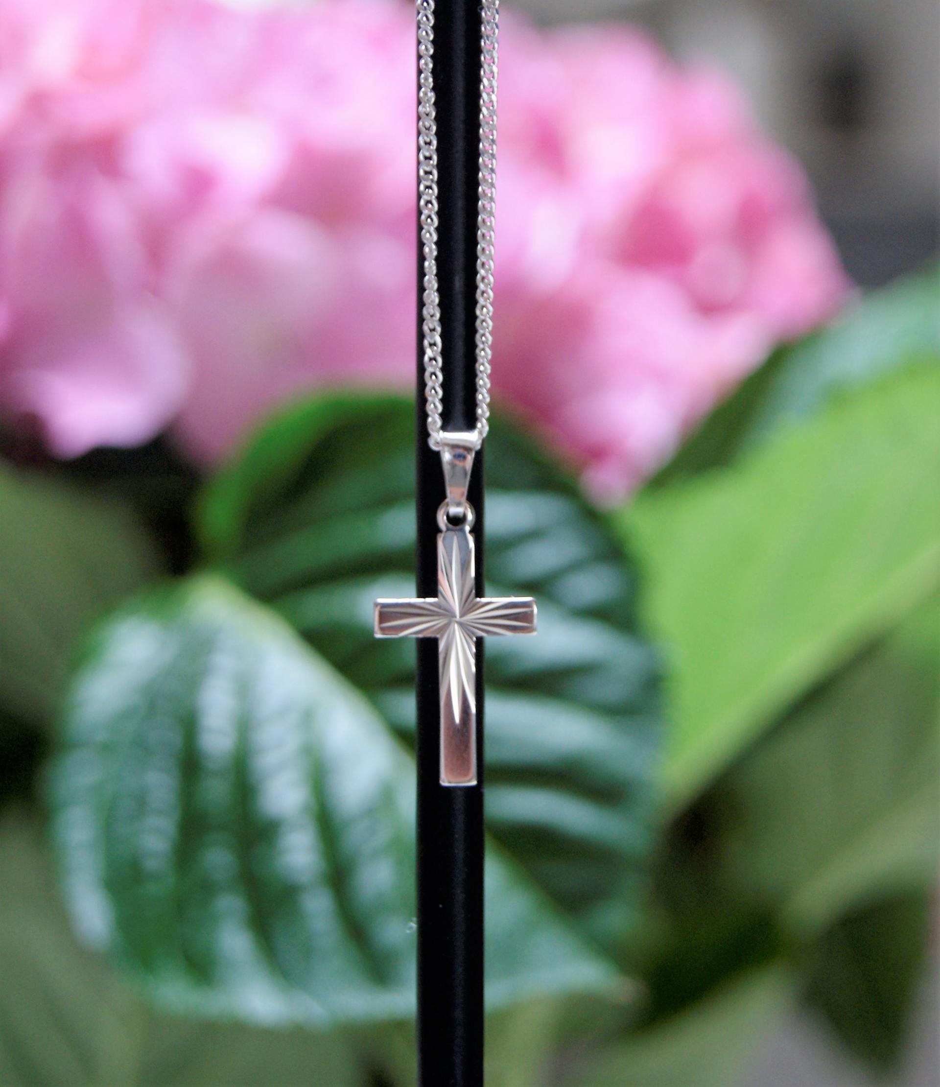 Hopeinen ohut kuvioitu risti panssariketjulla. Ketjun pituus 45 cm.