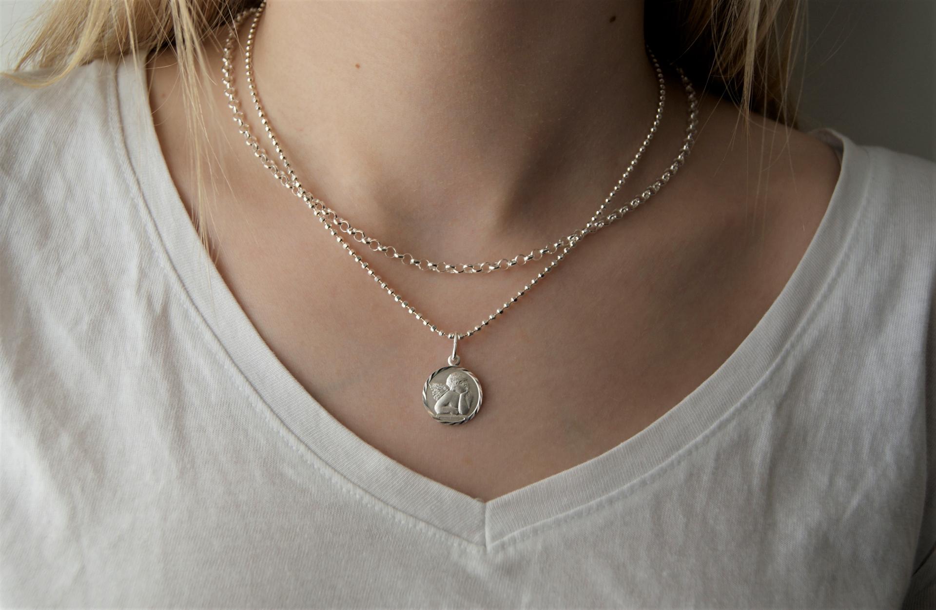 Hopeinen Enkelilaatta-koru timanttileikatulla ketjulla. laatan halkaisija 15 mm. Papuketju ei kuul...