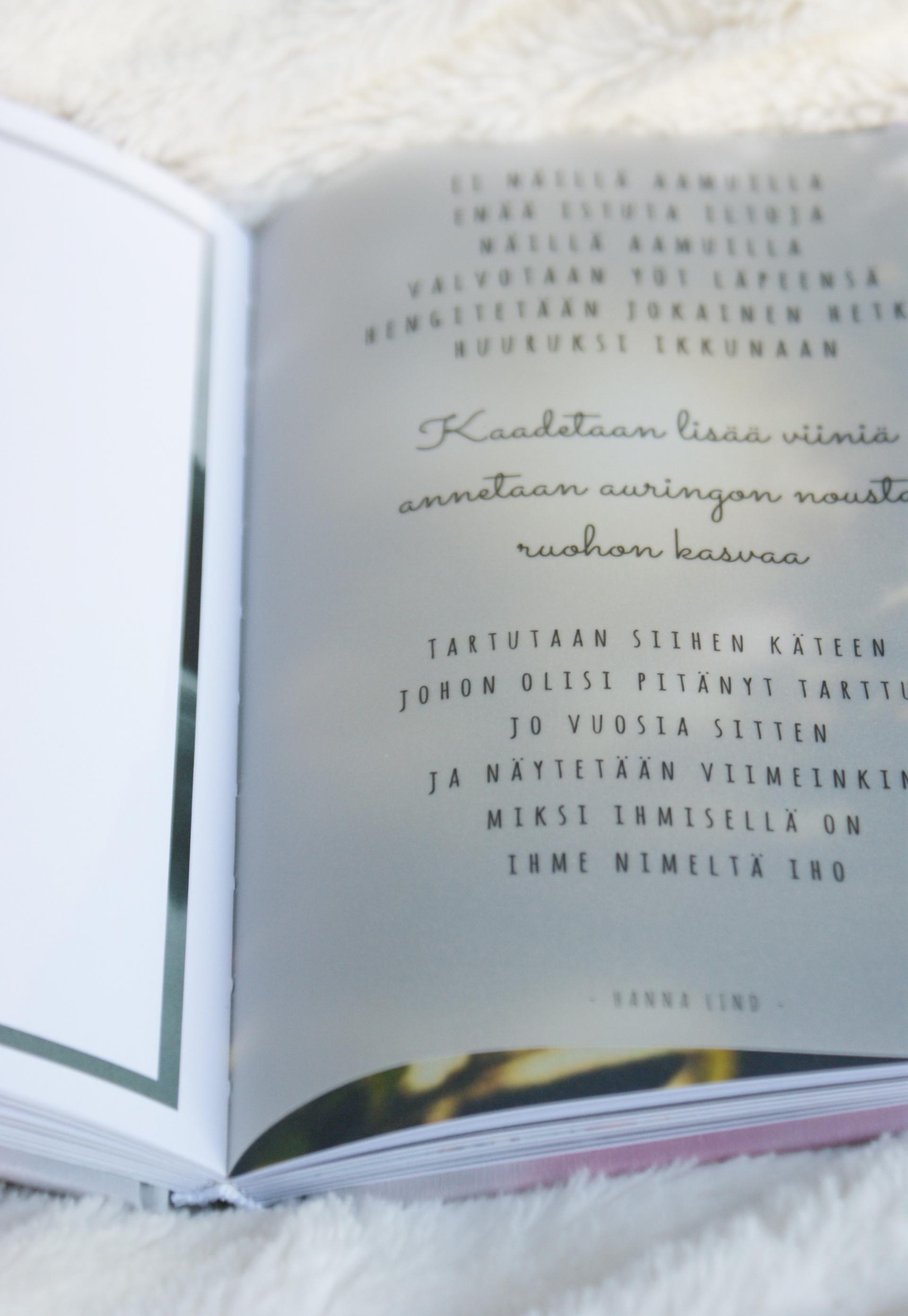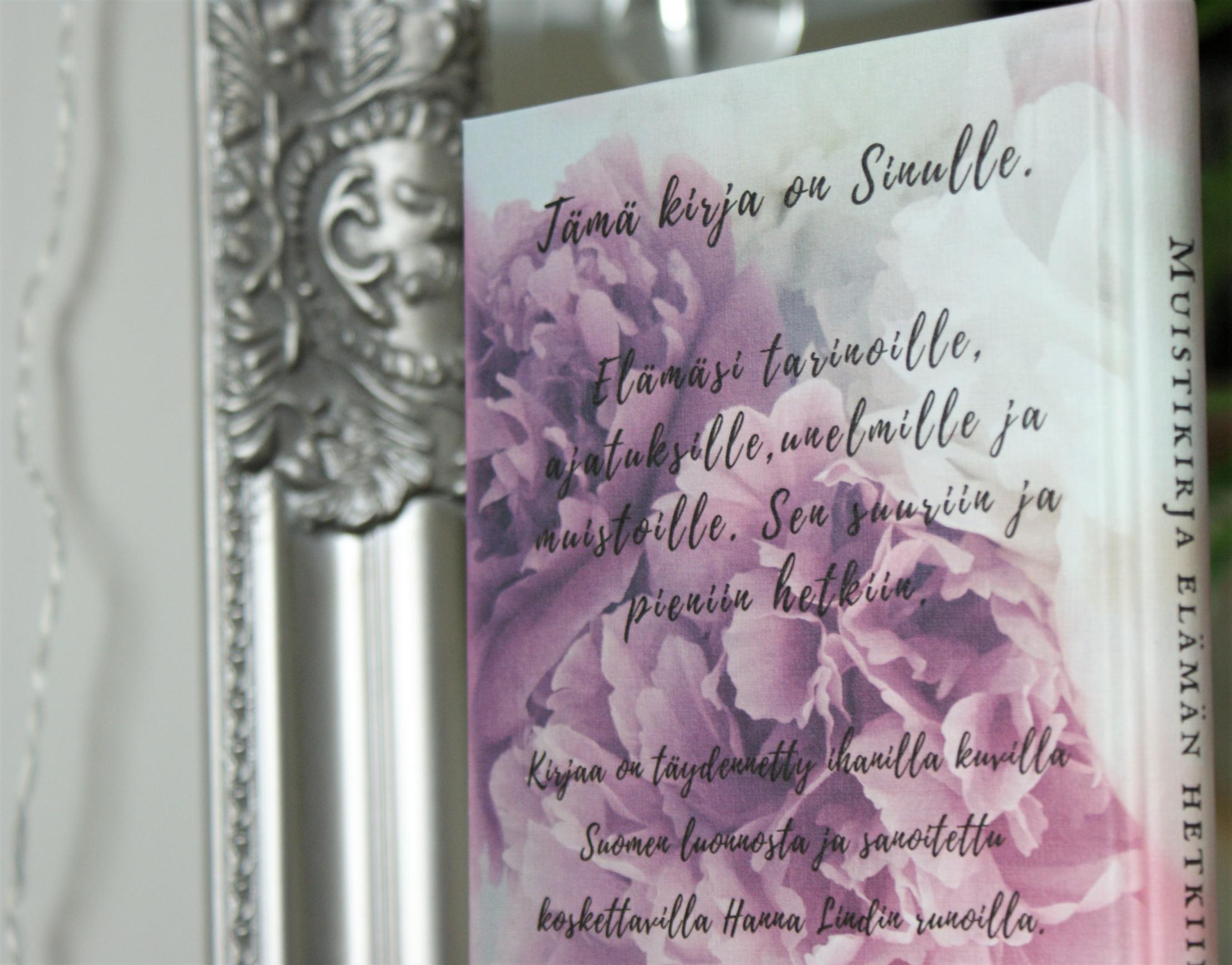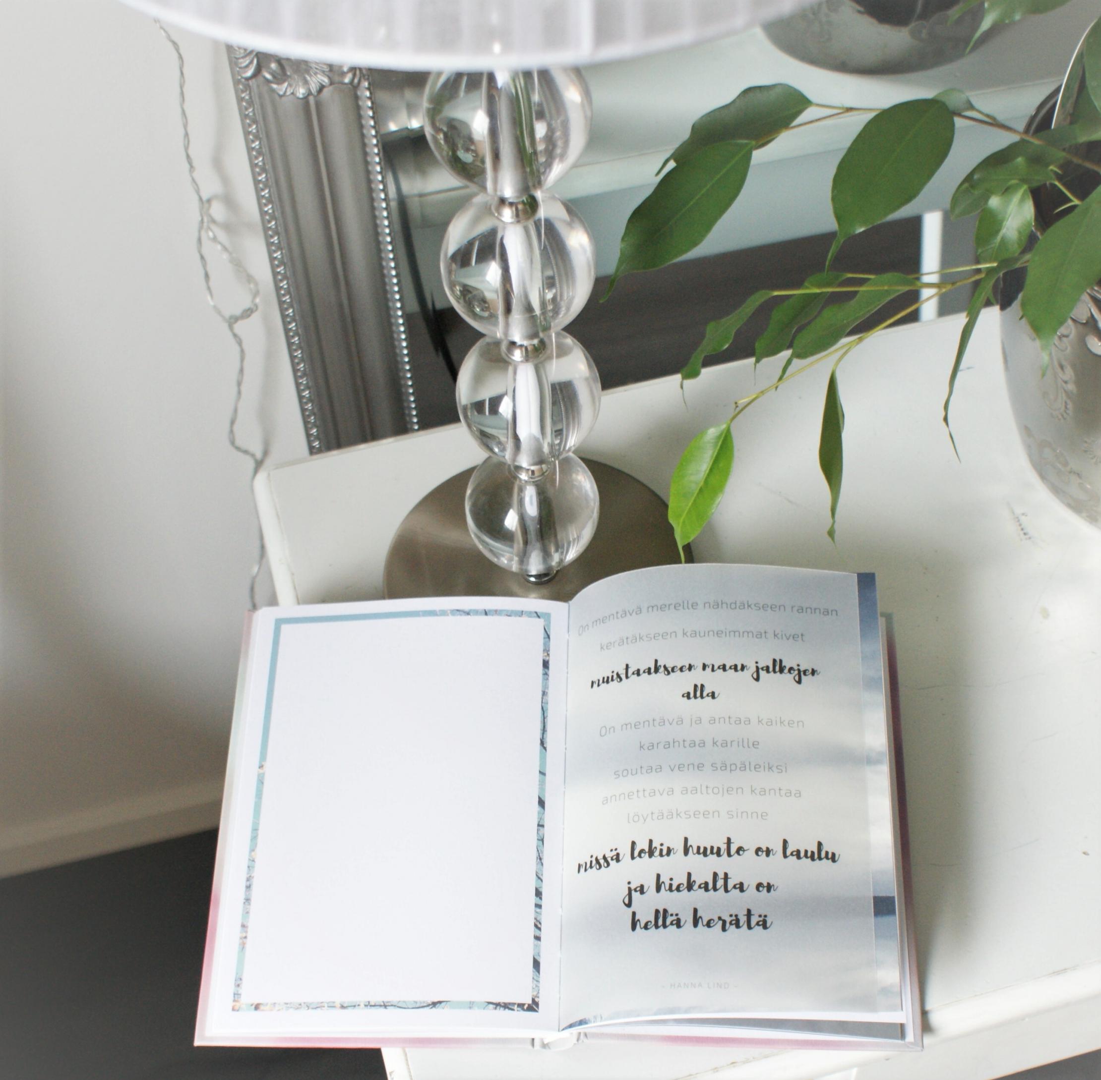 Tämä ihastuttava, ainutlaatuinen ja uniikki muistikirja on suunniteltu ja valmistettu Suomessa. Kirjassa on tilaa monille omille unelmille, ajatuksille, muistoille, toiveille ja kaikelle muulle, mistä ikinä haluatkaan jättää jäljen. Kirja sopii mainiosti esimerkiksi lahjaksi, päiväkirjaksi, unelmakirjaksi tai mihin vain! Kirjaa on kuvitettu kauniilla luontokuvilla. Kuvat ovat aidosti suomalaisesta maisemasta. Kirjaan on lisätty myös ihastuttavan Hanna Lindin runoja, jotka koskettavat ja inspiroivat. Anna siis kuvien ja runojen siivittää kertomuksiasi, unelmiasi tai ajatuksiasi. Saat niistä varmasti iloa, lohtua ja uusia ajatuksia. Runot ja kuvat voit irroittaa ja kehystää. Runot ovat painettu läpikuultavalle paperille.