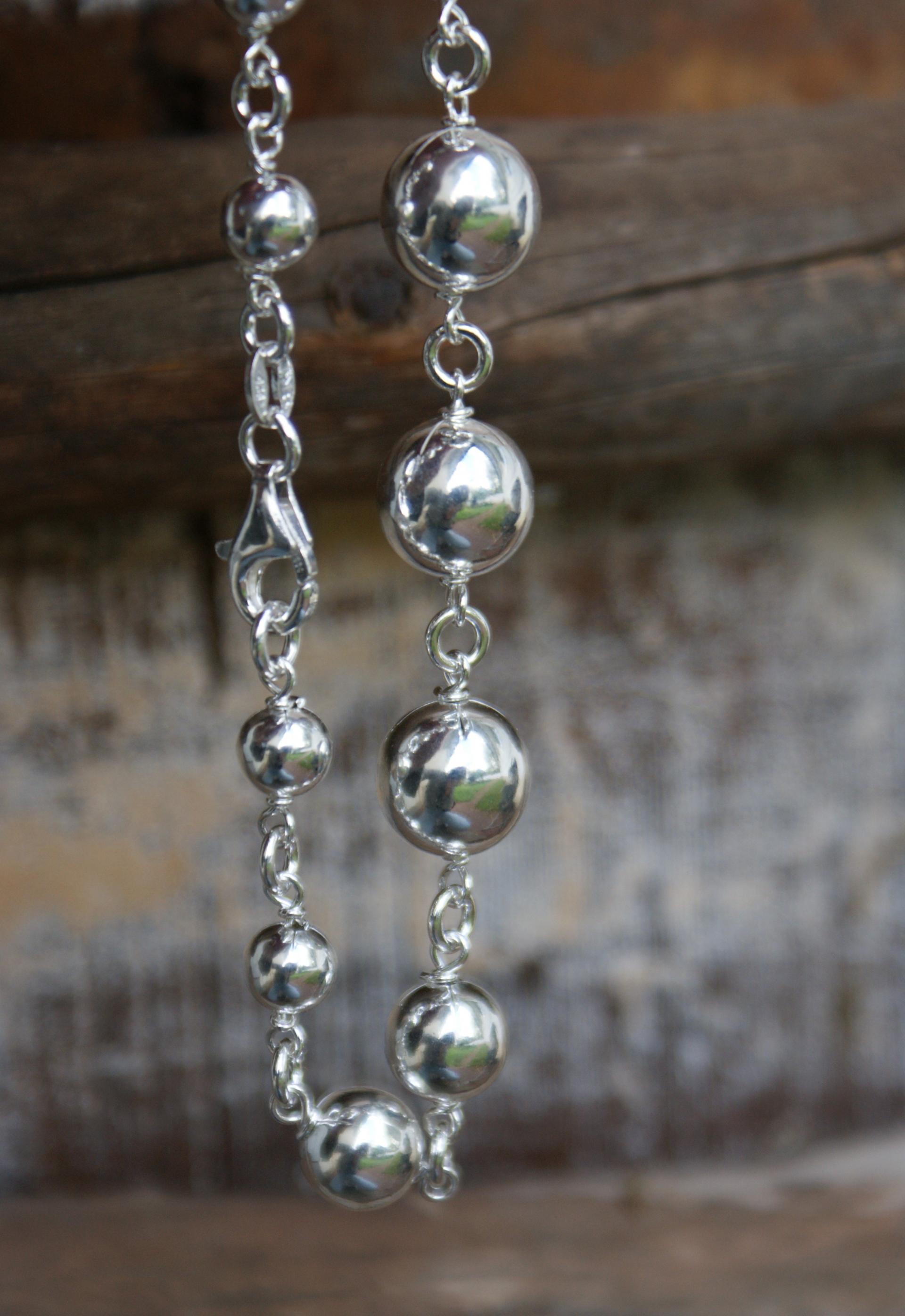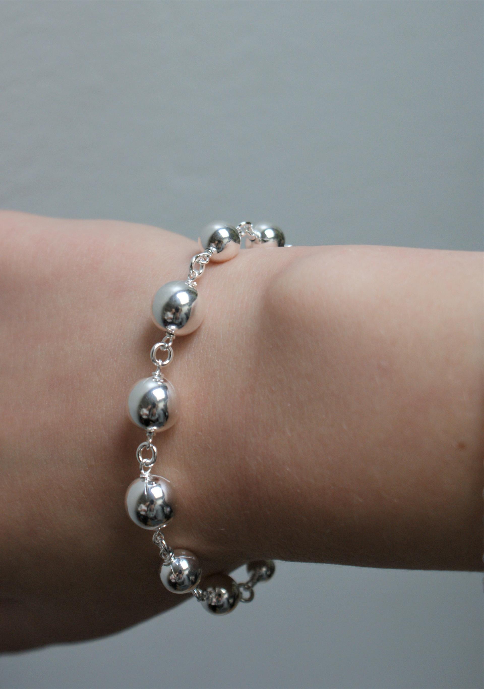 Hopeinen pallo rannekoru. Pituus 19 cm, leveys palloilla 6.10 mm.