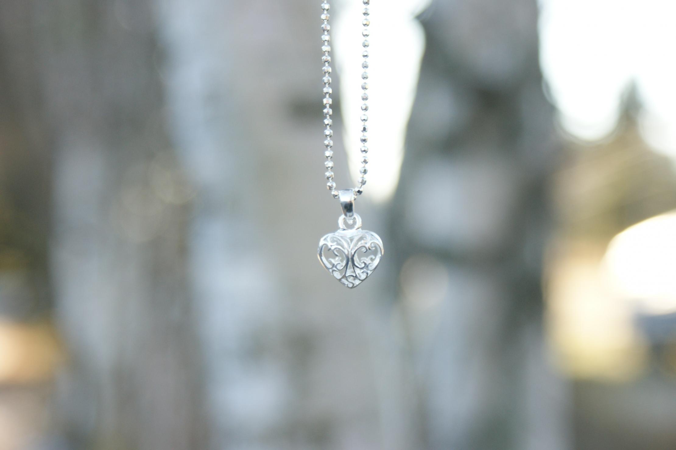 Hopeinen Pitsisydän riipus timanttileikatulla ketjulla. Ketjun pituus 45cm.
