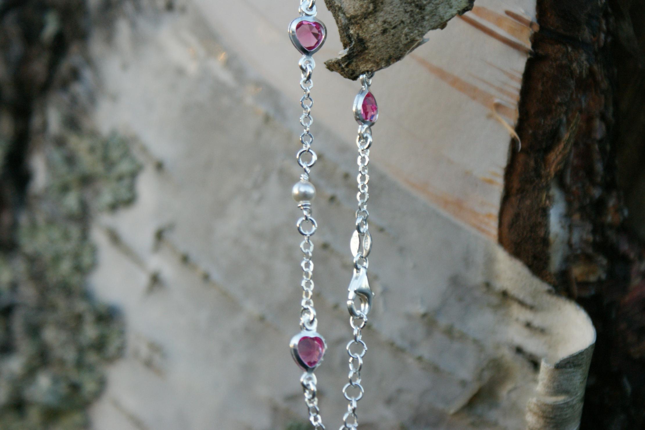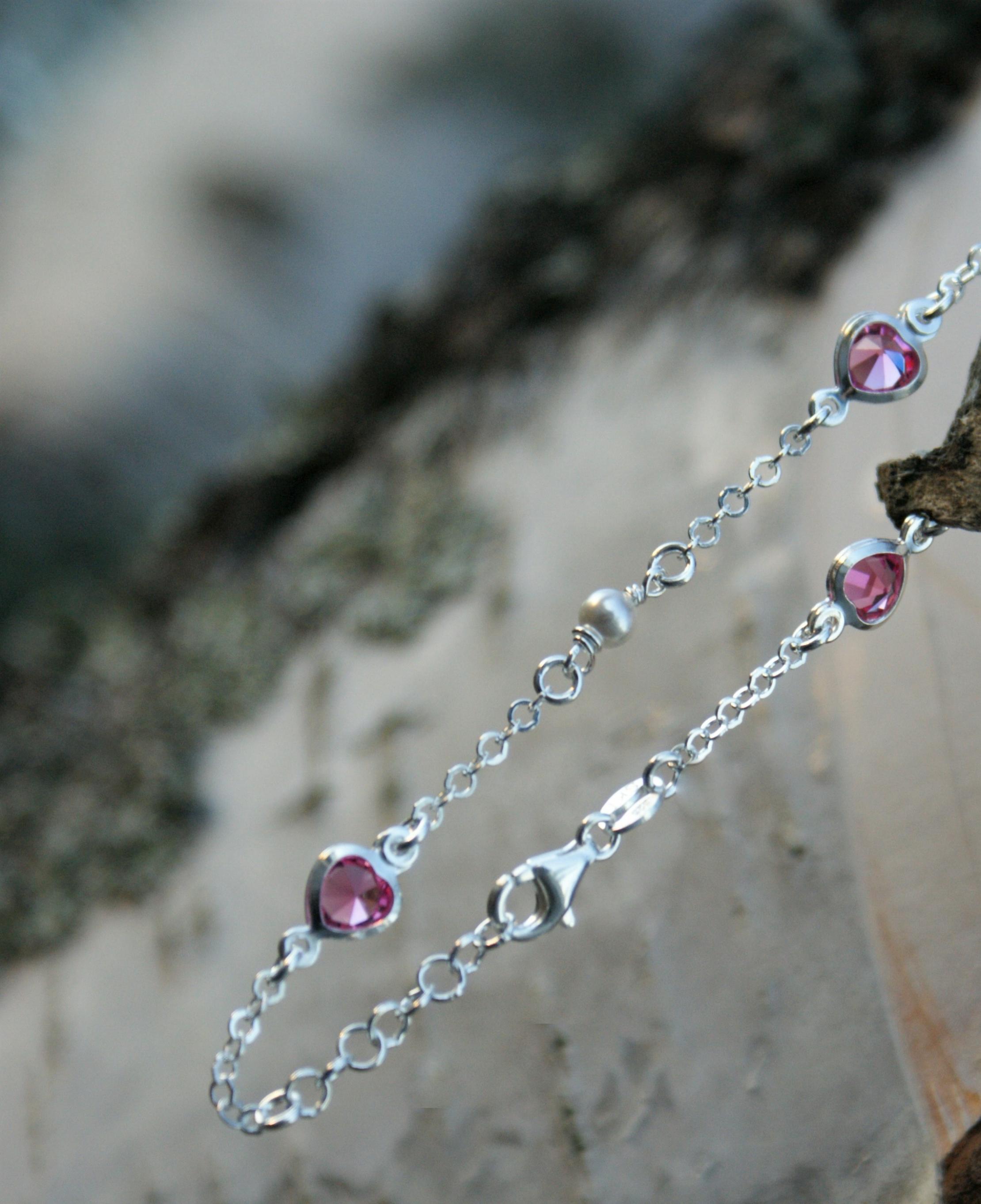 Hopeinen ranneketju pinkeillä zirkoneilla ja synteettisillä helmillä. Pituus 16 + 2 cm.