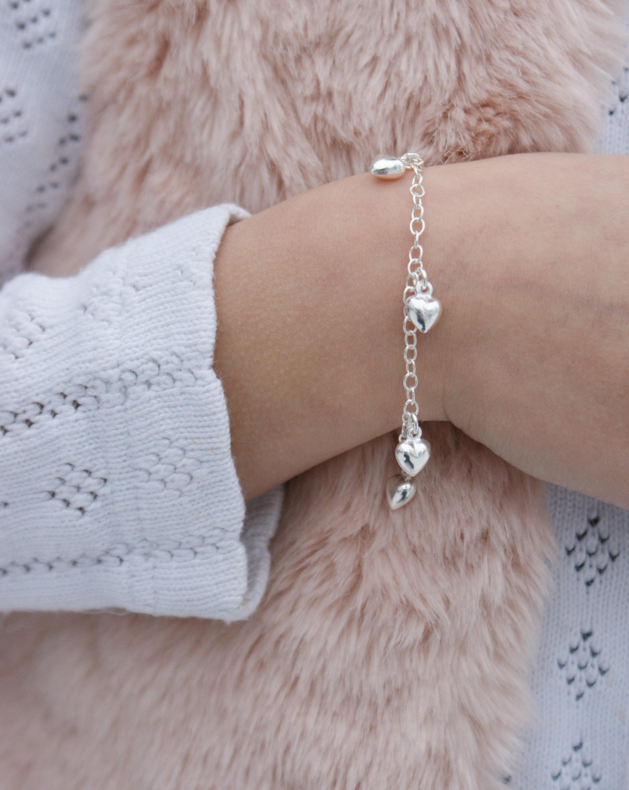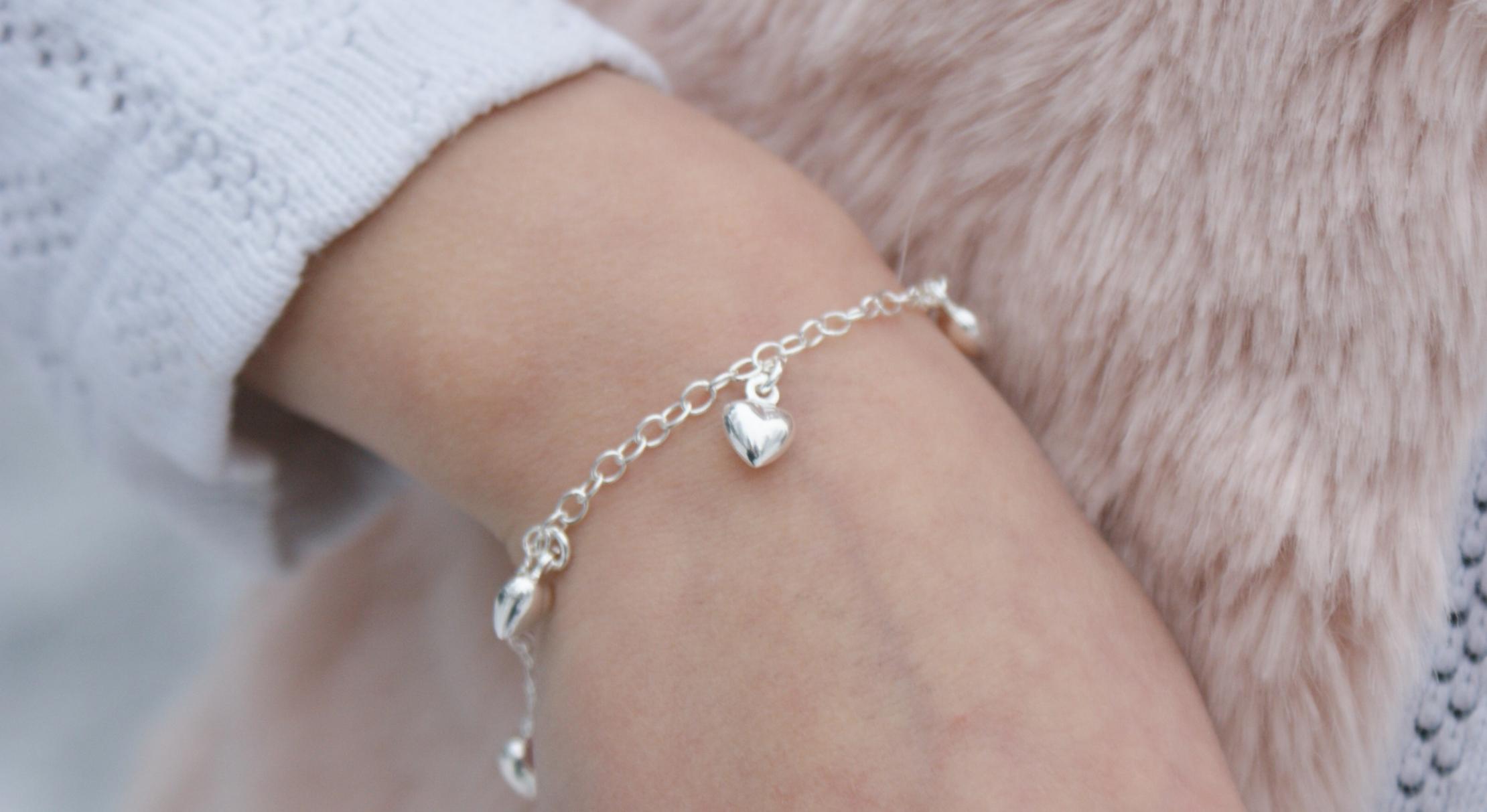 Hopeinen ankkuriranneketju kuudella sydämellä. Pituus 17 cm, saa myös laitettua lyhyemmälle.