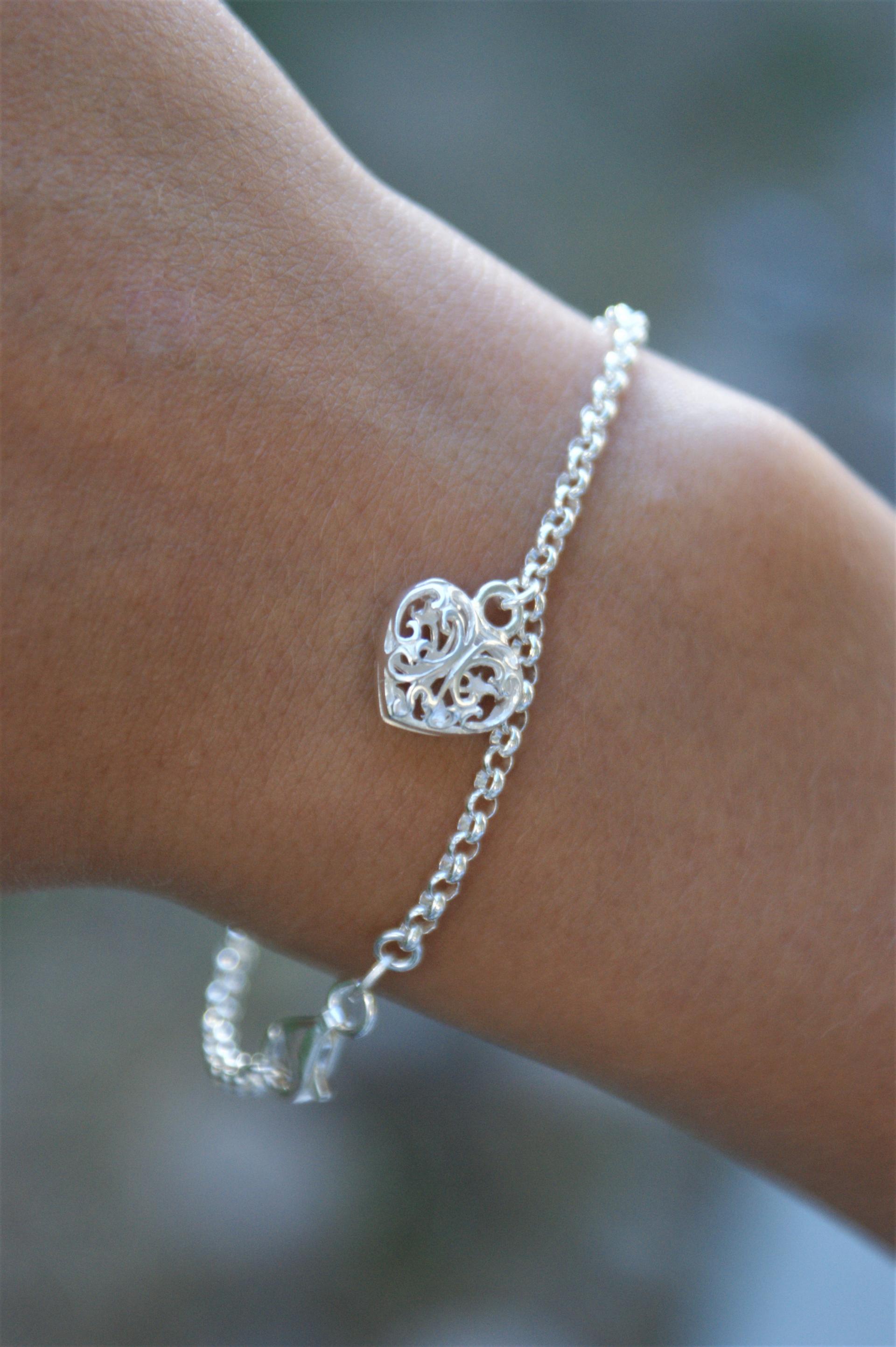 Hopeinen pitsisydän-ranneketju. Pituus 17.5cm.